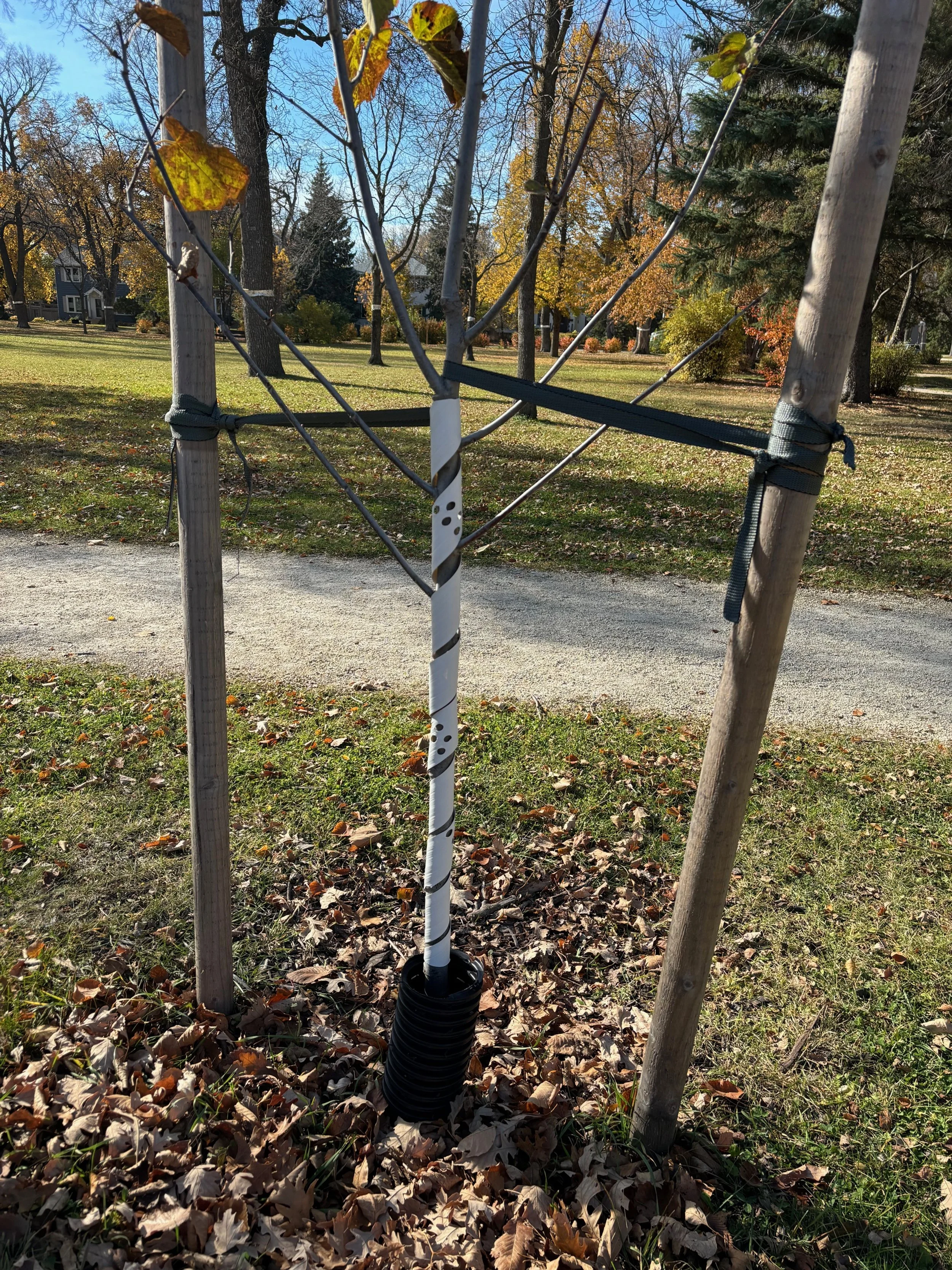 The white tree wrap is an inexpensive option that may provide some protection against damage to the bark. Weeping tile at the base of the tree provides protection from rodents and rabbits.